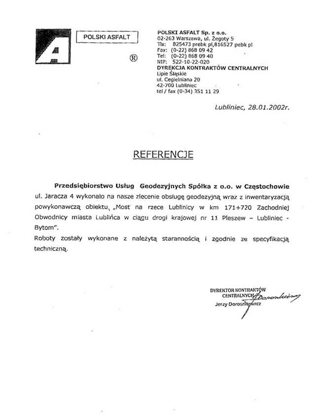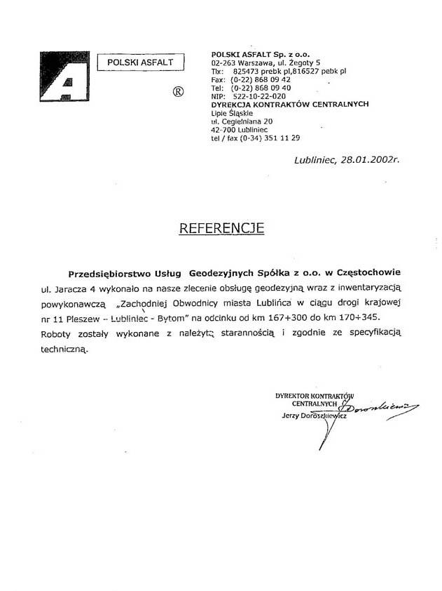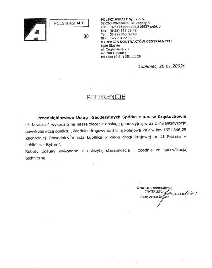 Obsługa geodezyjna budowy wschodniej obwodnicy miasta Lubliniec w ciągu drogi krajowej nr 11 Pleszew - Lubliniec - Bytom na odcinku od km 167+300 do 170+345 (Referencje) oraz na odcinku od km 170+345 do km 175+200 (Referencje). Obsługa obejmowała również budowę wiaduktu drogowego nad linią kolejową PKP w km 169+846.25 (Referencje) oraz mostu na Rzece Lublinicy w km 171+720 (Referencje).